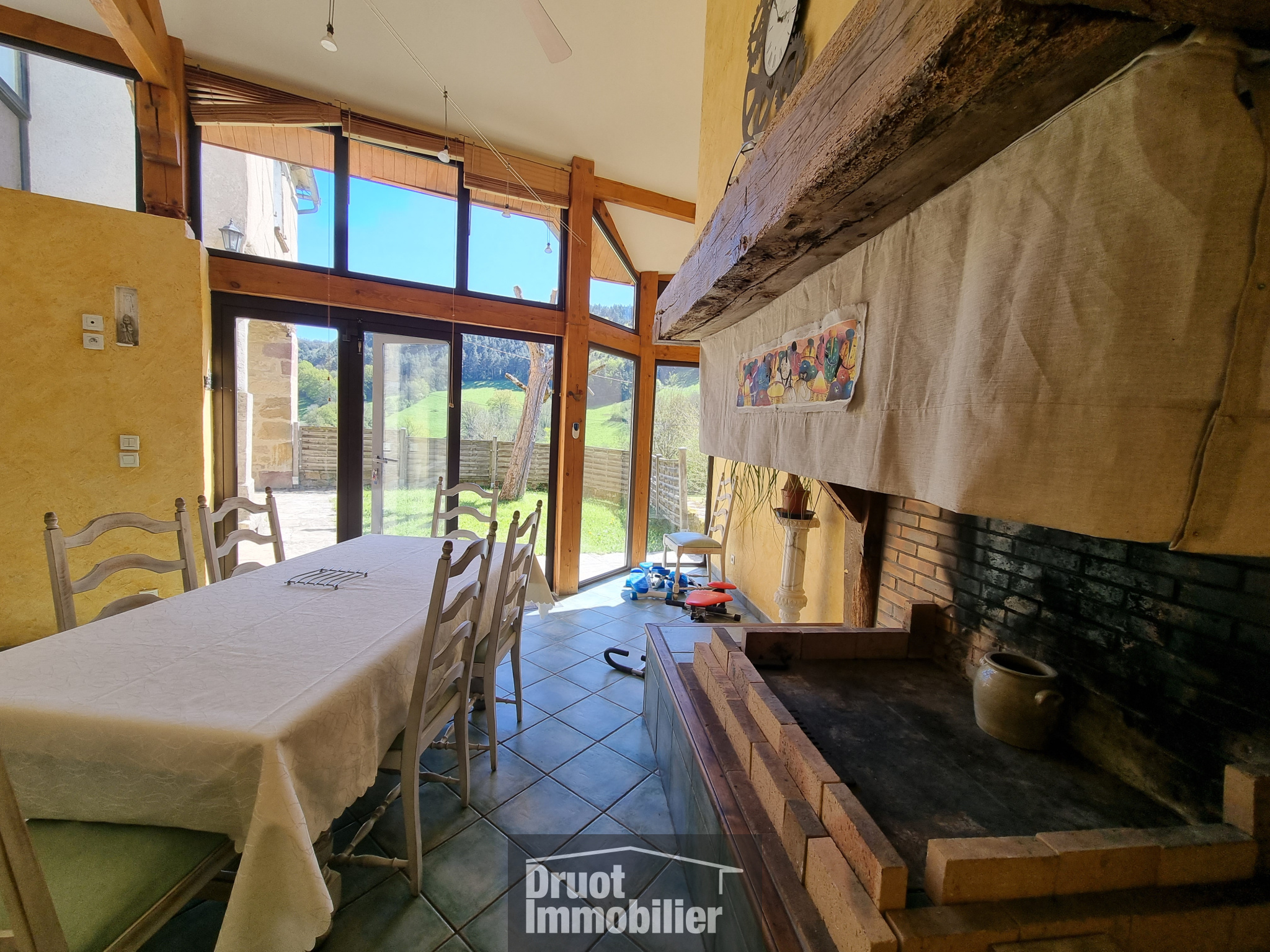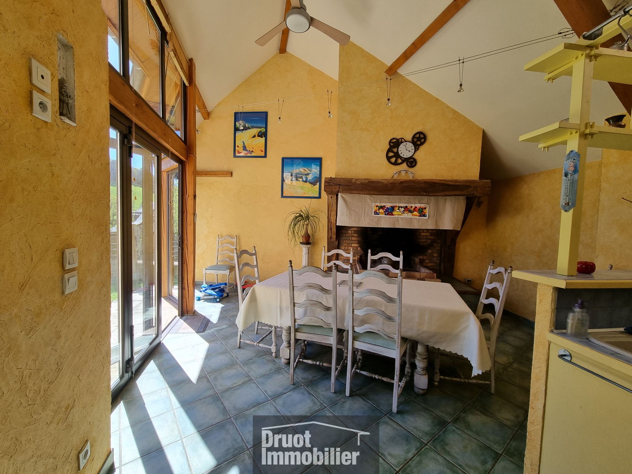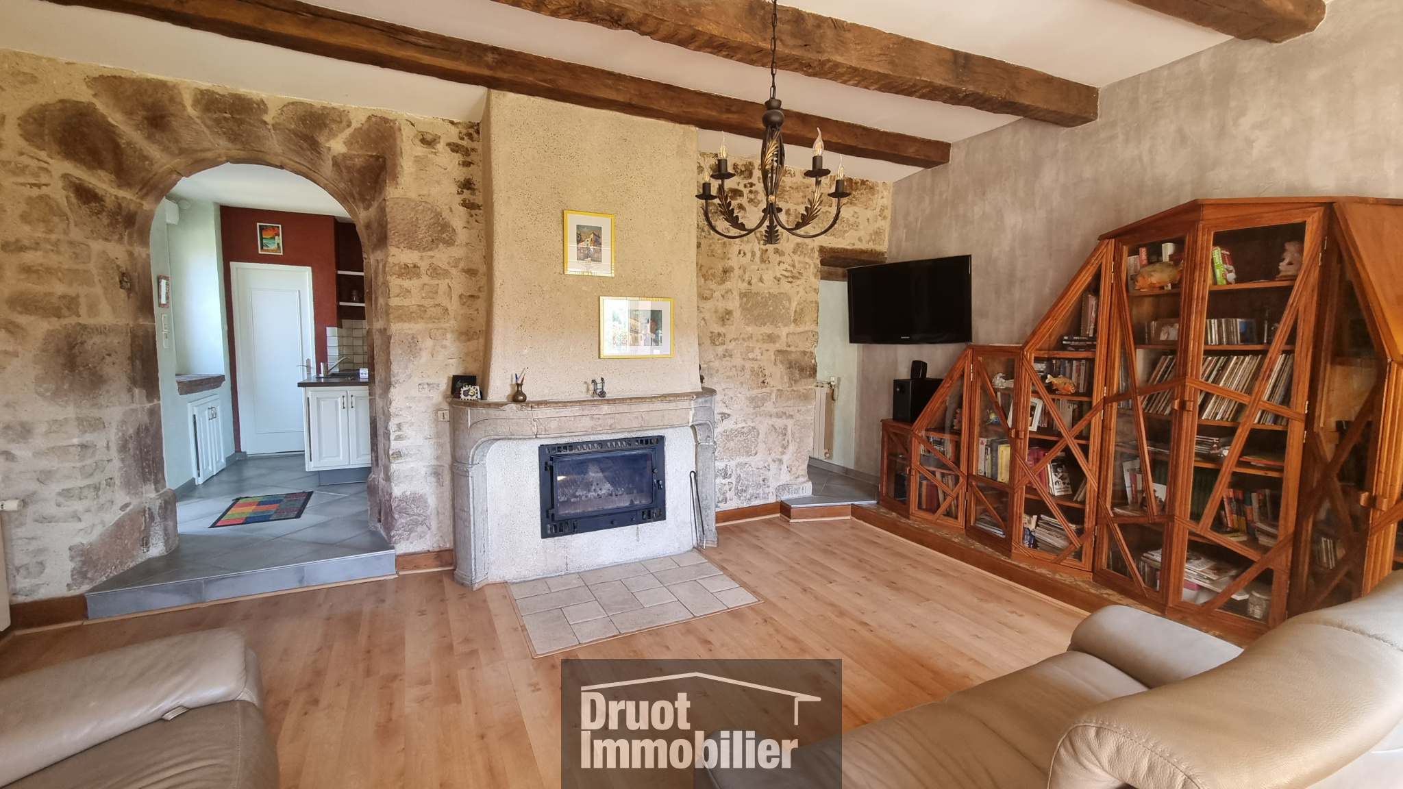 En rdc, 1 cuisine salle à manger, équipée avec cheminée, baies vitrées ouvrant sur le jardin et 1 chambre indépendante avec salle d’eau privative et wc. A l’étage, 1 cuisine équipée, 1 salon avec sa magnifique voûte en pierres, cheminée insert, 1 chambre,1 salle d’eau (douche et baignoire) et un wc. Au 2nd, 2 chambres et un espace grenier. Caves. Chauffage mixte pompe à chaleur et fioul. Huisseries PVC double et vitrage, alu pour la baie vitrée et la véranda.Volets roulants electriques. Isolation laine de verre. Puits. Garage avec citerne de récupération d’eau. Assainissement à prévoir. 1 barbecue et un four à pizza pour profiter du superbe terrain avec son verger et de son environnement.