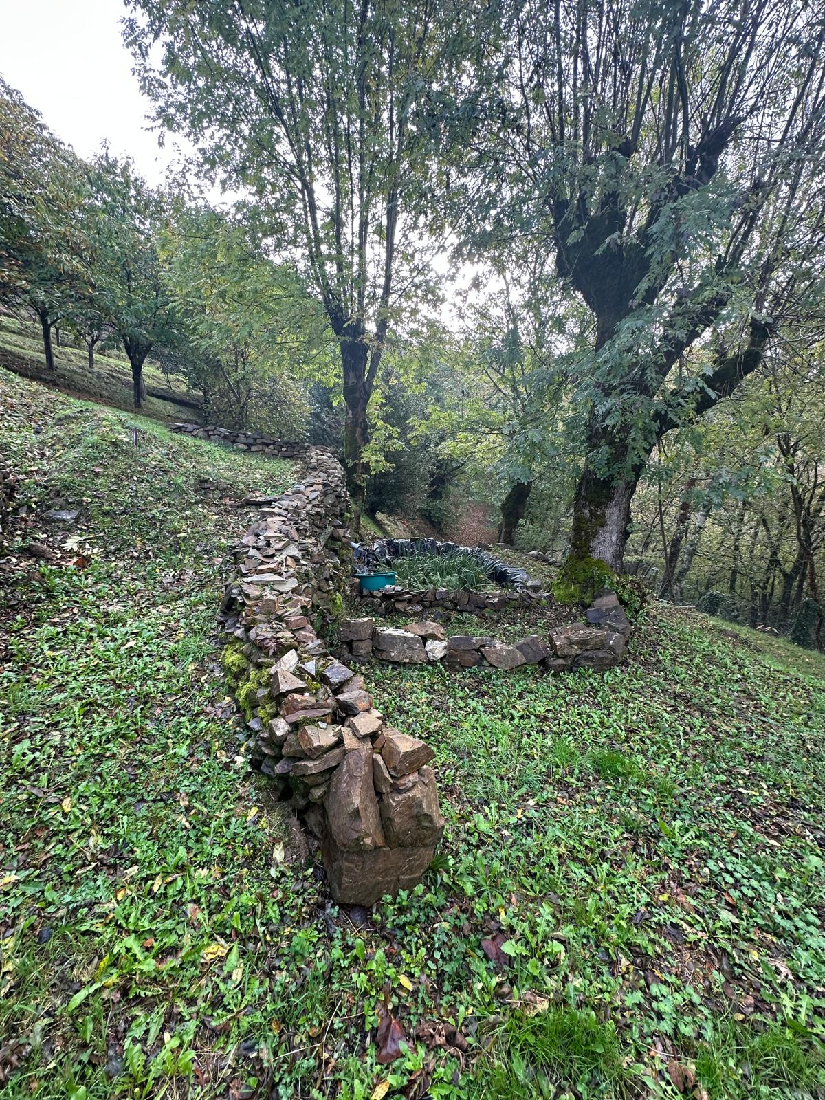 Le terrain est aménagé en terrasses avec des rangées d’arbres fruitiers (une centaine sur la propriété) et bénéficie de deux sources avec les captages déjà réalisés.